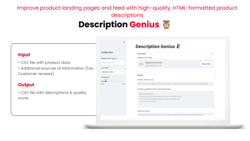 Description Genius - can generate product descriptions in the format of your choice using the latest advances in Generative AI. Be it a single paragraph, multiple paragraphs with headlines or even HTML tags. With Description Genius you can easily generate captivating product descriptions using product features and any additional sources of information that you may have e.g. product reviews, usage instructions, website data etc.