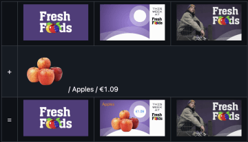 Product Video Ads - builds ad videos by taking a base video (effectively a template) and putting product information (names, images, prices etc.) on them, updating automatically when there are changes to the configuration, prices etc. For example, retailers who have different special offers in different cities, can use this mapping to efficiently create localised video ads and update them whenever the assignment changes.The following example illustrates the functionality with a single product in a single video: a template video (shown are frames from its beginning, middle and end) is combined with a product (data and image) to yield a video that advertises that product: