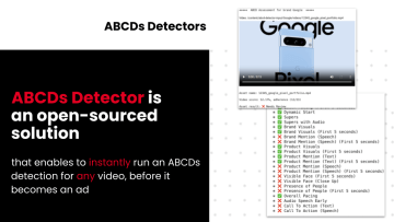 The ABCDs Detector solution streamlines the assessment of your video ads against YouTube's ABCD framework. Powered by Google AI, this tool automates the evaluation process, providing detailed reports on how well your ads align with key attention-driving metrics. Simplify your YouTube ad analysis and gain valuable insights for optimization with the ABCDs Detector.