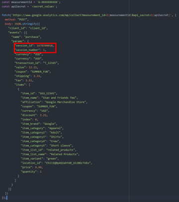 Many companies send some of the events through the Measurement Protocol, for example, after the real profit per purchase has been determined. In Universal Analytics, if the transaction was sent correctly, it was assigned to that user’s session automatically. However, this is not the case in GA4 because sessions are not created during the processing of the data. In this case, it is necessary to enrich the data with a session ID when sending the data through the Measurement Protocol.