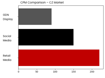 In the Czech market, retail media CPMs for premium, highly targeted placements typically range from100 to 300 CZK, significantly higher than social media CPMs, which are usually below 100 CZK, and Google Display Network rates often under 30 CZK[14].