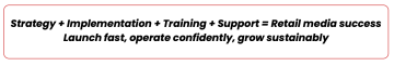 Our comprehensive service ensures ecommerce brands can rapidly launch retail media capabilities, build operational knowledge internally, and grow sustainably with expert backup.